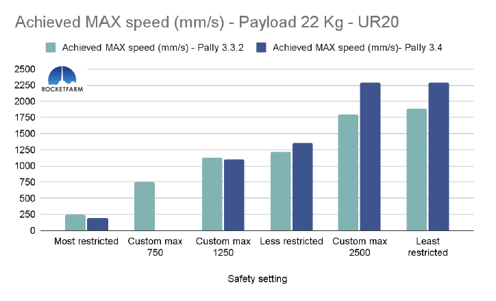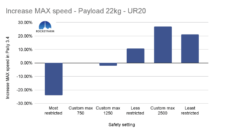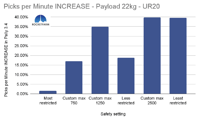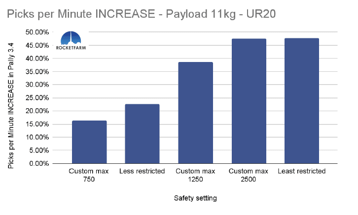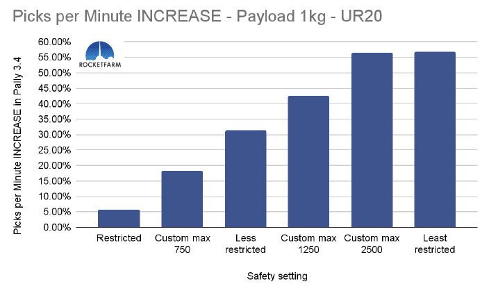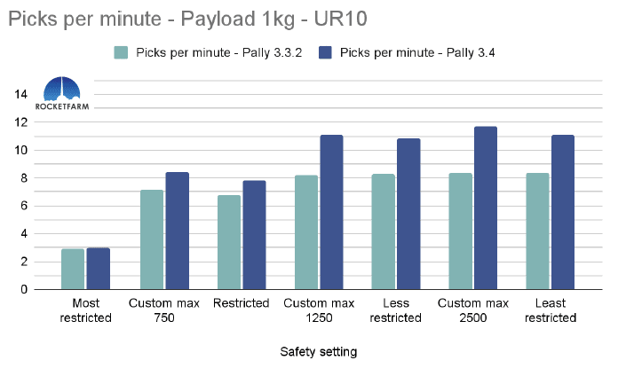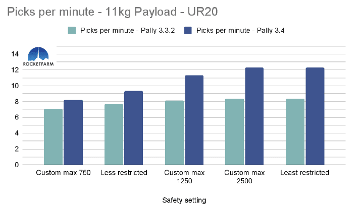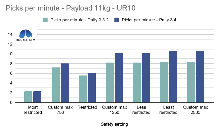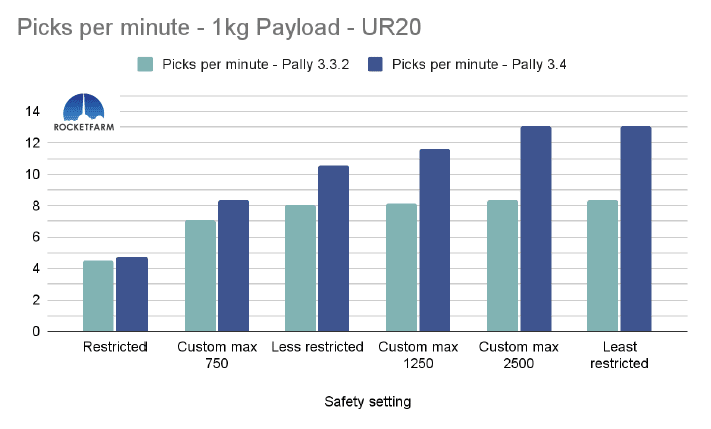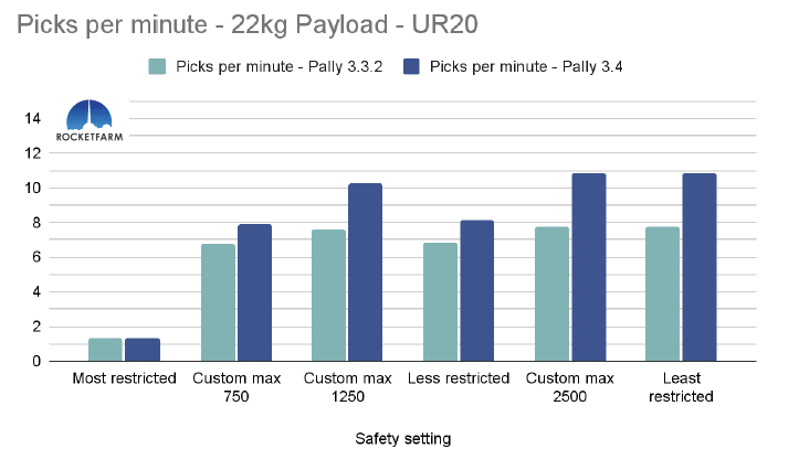 In the chart below, both safety settings have a max speed of 750mm/s, but in the Custom max 750, every other setting is set to the same as the default “least restricted”. Even in Pally 3.3.2, this difference is obvious, achieving an added 2,5 picks per minute. In Pally 3.4, this effect is even higher, achieving ca 3,5 extra picks per minute in this 1 KG payload example using a UR20.