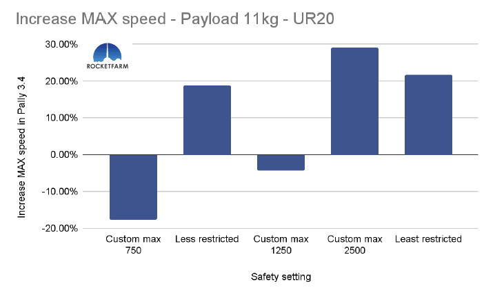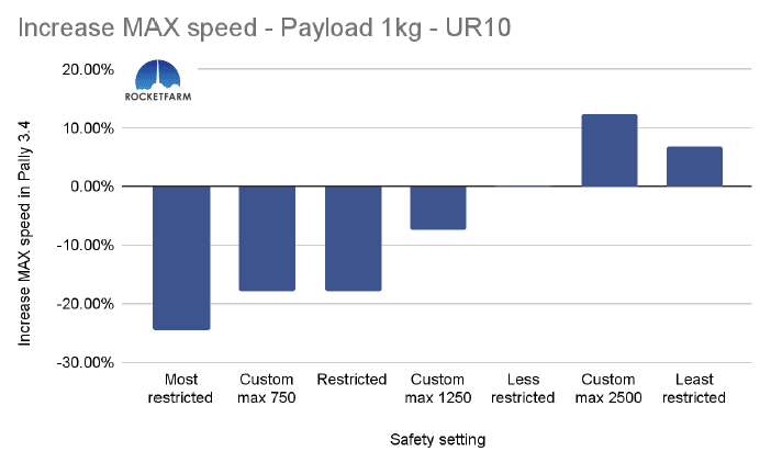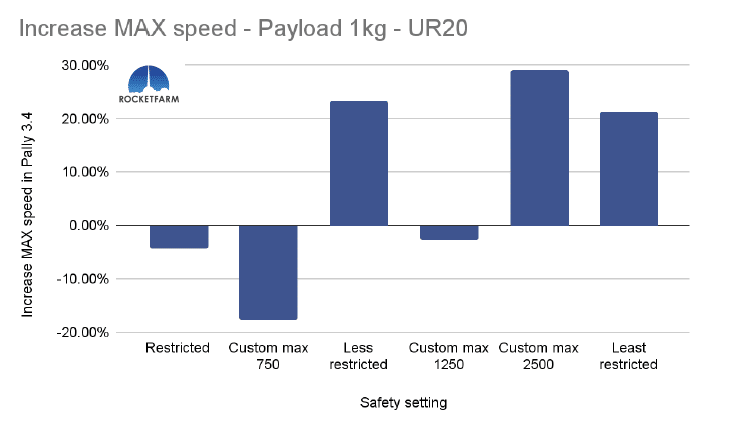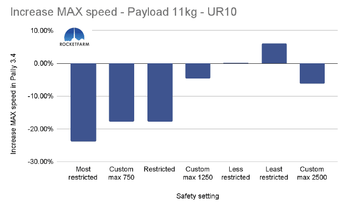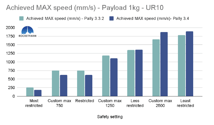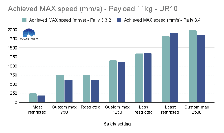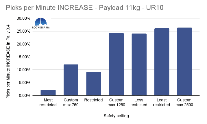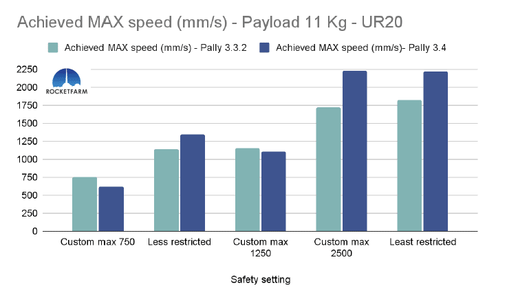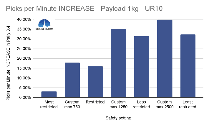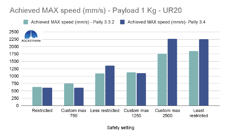 In the chart below, both safety settings have a max speed of 750mm/s, but in the Custom max 750, every other setting is set to the same as the default “least restricted”. Even in Pally 3.3.2, this difference is obvious, achieving an added 2,5 picks per minute. In Pally 3.4, this effect is even higher, achieving ca 3,5 extra picks per minute in this 1 KG payload example using a UR20.